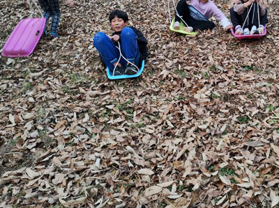 枯れ葉が落ちた裏山でそり遊びを楽しむヤタ。“何もない”山も一工夫するだけで、たくさんの遊びが生まれます。