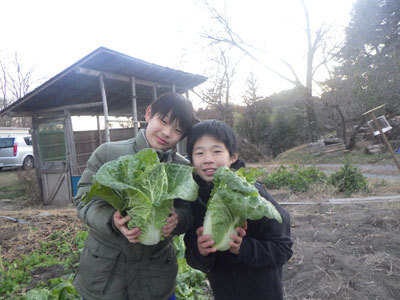 夜ご飯の準備中、「冷蔵庫に白菜がない!」と気づいて早速畑に採りにきたモクとなっちょる。野菜の収穫が暮らしの一部として根付いてきました。