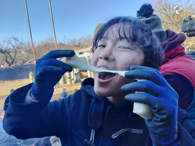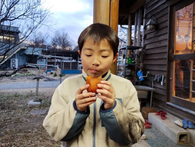 ダイキが頬張っているのは干し柿です。泰阜の冬の寒さで十分に甘くなった干し柿は、みんなの大好きなおやつです。