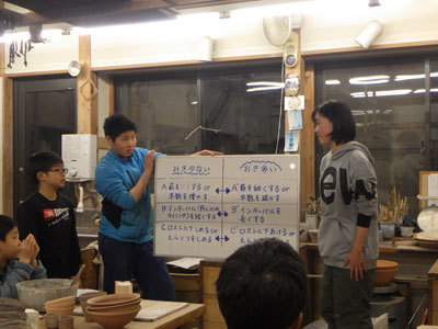 今週も登り窯に向けて、2年目・3年目メンバーが1年目のメンバーに窯焚きのレクチャーをしました。何度も話し合って頭を捻りながら考えたレクチャー。図やイラストを使って、自分の経験を伝えます。窯の焚き方もこどもたちが代々引き継いでいるのです。