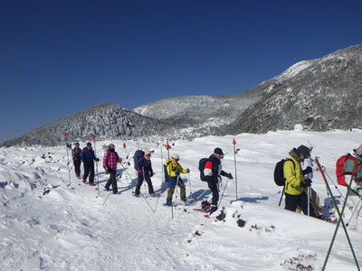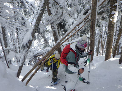 雪だらけの樹林帯に入りました。寒さや急坂で心が折れそうになるときも、「あともう少しだよ、頑張ろう」と互いに声をかけながら前に進んでいきます。
