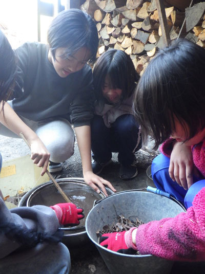 放課後に風呂焚きに使っている廃材から出た鉄くぎを囲んで作業をするこどもたち。“鉄媒染”という染め物の媒染方法を実践してみようとチャレンジしています。