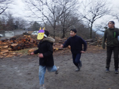 節分だったので外で豆まきを行いました。だいだらぼっちで育てた大豆をまき、鬼の仮面は一から手作り。オリジナルの豆まきを楽しみました。