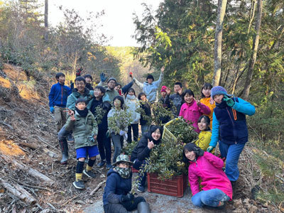 みんなで森へ行き、たくさんのソヨゴを集めました。今年度盛んに取り組んできた染め物の集大成に、泰阜村のソヨゴを使って全員でおそろいの染め物にチャレンジします。