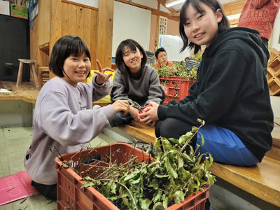 さっそく枝葉をハサミで小さく切る作業にとりかかります。「細かく切ったほうが色がでやすいんだ」と小さな手間も惜しみません。