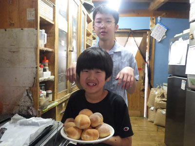 数日後、なおきも影響を受け朝ごはんであんぱんづくりにチャレンジしました。急遽ただっちも手伝いに参加してくれました。なおきは美味しく焼き上がって嬉しそうです。