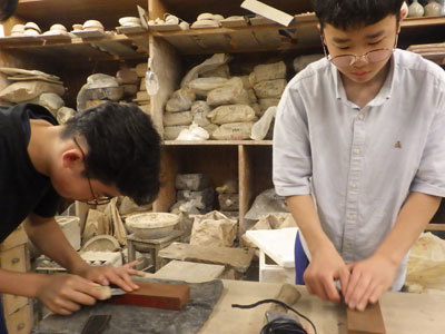 ものづくり教室で刃物を砥ぐ話を聞きました。早速、実践するただっちとキャンプは道具を大切に長く使って行きたいと真剣な表情です。