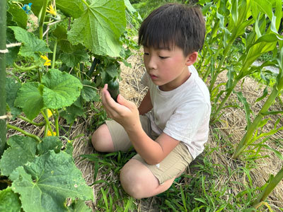雨が降ると野菜がびっくりするほど成長します。気が付くと畑のキュウリが大きくなっていました。早速収穫して初物のいただきました。