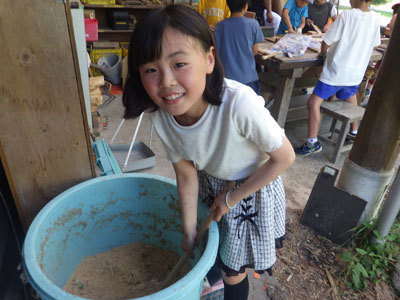 にわとりのためにブレンドした発酵飼料づくりも本格的に量を増やして作ります。米ぬか等の身近な材料で実験して作り上げました。これでもっと元気に育ってね!