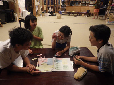 こちらは「台本隊」が話し合い中。11月に行う「だいだらぼっち祭り」では手作りの劇をやることに決めました。「夏休み中にアイデアを考えて来よう!」と気合十分です。