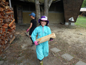だいだらぼっちの2学期がスタート!早速、お風呂が焚きやすいように、乾いている薪を焚口の近くへ移動する作業をしました。これも自分たちの暮らしに欠かせない大切な仕事です。