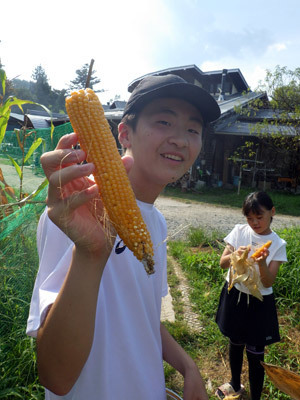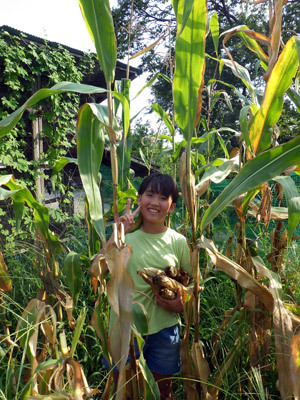 夏休みの間に畑の作物が大きく成長し、ポップコーンは2mほどの高さに!「よく見ればたくさんできてる!:」とポップコーンを収穫し、嬉しそうな2年目ののはです。