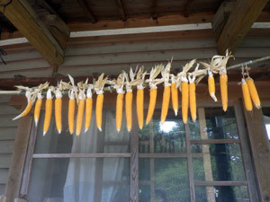 収穫したポップコーンは一つひとつ丁寧に結び、軒下にぶら下げてしばらく乾燥させます。ポップコーンを食べる日が待ち遠しいです。