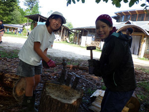 週末は薪作業でした。クサビという道具を使って太い丸太を割ります。2年目ノハと4年目仲っちゃんは慣れた手つきでクサビを打っていきます。職人さんみたい。