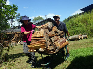 割った薪は一輪車で運びます。一輪車に乗り切れないほどの薪を積んでいますが、中2のタダッチは上手に押します。力があって頼もしいです。