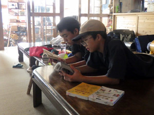 作業の合間の休憩です。二人並んでマンガを読んでいて微笑ましい光景。