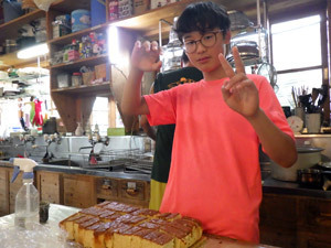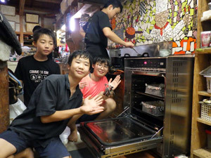 休みを利用して、男の子たちが集まって、カステラにチャレンジしました。だいだらぼっちにはガスオーブンがあるので大きなカステラも同時に3つ焼くことができるのです。