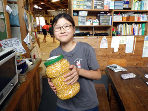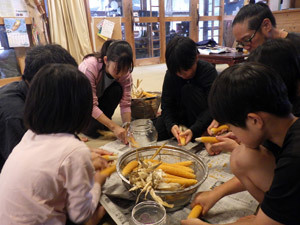 ポップコーンが干し終わりました。みんなで粒を外します。みんなで暮らしの仕事楽しいです。