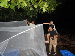 野宿が大好きなこどもたち。月に一回は野宿をします。夏場は虫に刺されるのが課題ですが、蚊帳があれば大丈夫。虫対策にもなるしなんだか楽しいし、一石二鳥です。