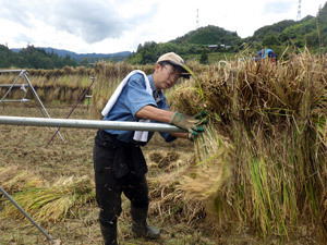 縛った稲は稲架(はざ)にかけて干していきます。刈って、縛って、干す。次の人のことを考えて丁寧にすることが大切な作業です。日頃の団結力の見せ所です!