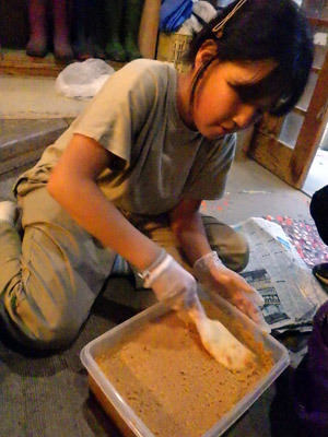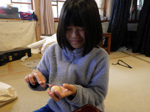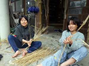 なかっちゃんとのはは田んぼのわらを綯い、しめ縄やおやすを作っています。この作ったものは祭りの飾りつけにつかう予定です。手間のかかる作業ですが、「祭りの盛り上がる雰囲気にしたい」と頑張っています。