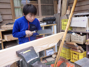 「祭りといえば、みこし!!」ということで、さらに祭りを盛り上げるためにみこしを作りました。ちゃんと人が安全に乗れるように考え、慎重に材を切っていきます。