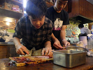 村でアマゴを養殖している方からたくさんアマゴをいただきました。魚を捌くことは初めてでしたが、まさに、やればできる!で魚の構造をみて包丁使ううちに、段々と手さばきが早くなっていきました。