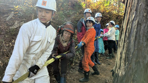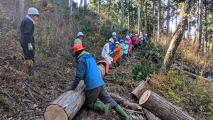 あんじゃねの森で「山出し」を行いました。朝から夕方まで山に入って、薪を集める作業です。今年は、スタッフがヒノキの間伐を行い、その丸太をこどもたちが運び出し、森の中に集めておく作業をしました。