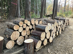 無事に山出しが終了しました。これだけの量のヒノキを運び、集めることができました。今後、森に遊びに行く度に持ち帰る予定です。