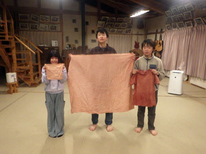 こちらはソヨゴで染めた布。あんじゃねの森から取ってきたソヨゴです。こんなに鮮やかなピンク色が出るのでびっくりです。