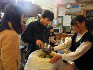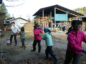 お風呂で使う薪をみんなでリレーして運びました。「ハイ!」の掛け声とともに薪がリズムよく流れていきます。仲間と動きを合わせる心地よさと楽しさで、作業もあっという間に終わりました。