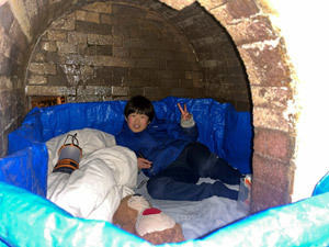 「登り窯のなかで寝てみたい」とこどもたちが自分で計画した『登り窯野宿』。小さな部屋に自分だけの寝床つくり、準備万端のなおきです。
