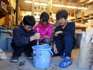敷地のねむの木を使って、1年目の3人が釉薬づくりに挑戦中。初めての作業にも、興味いっぱいで手を動かしていきます。
