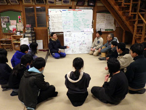 こどもたちは4時間交代で窯焚き当番を回します。当番が変わる度に、どんなことに注意をしながら焚いてきたのか、情報の引き継ぎをします。