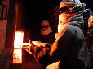 窯焚き3日目です。窯の温度は1,000度近くまで上がってきました。ものすごい熱気で怖気づきそうですが、1年目のハレも果敢に薪をくべます