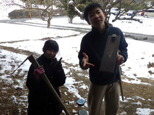 だいだらぼっちも残すところ2カ月を切りました。そこで、次年度に向けて壊れた物をどんどん修理していきます。ただっち、かなにゃんはくわの修理をしています。