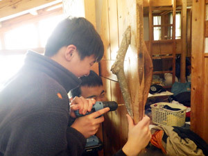 こちらは部屋の取っ手を修理中。薪の中から取っ手に合いそうな木を探してきて、上手く加工して取り付けていきます。