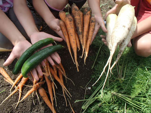 作る野菜はこどもたちが決めていきます。とうもろこし、きゅうり、トマト、すいか、たまねぎ、サトイモ、さつまいも、ゴーヤやこんにゃくいも・・・何を育てるかは毎年違います。毎週の草取りは大変ですが、収穫の喜びは格別です。形や大きさは悪くてもがんばって作った野菜の味にこどもたちは「だいだらぼっちの野菜は甘い!」「味が違う!」と言い、こどもたちは本物の味を知ります。