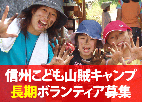 信州こども山賊キャンプ長期ボランティアスタッフに関する情報長期ボランティアは自己成長のチャンスです。休みの時間をどう使うかはあなた次第!授業や講義からでは決して得られない感動と学びの大きな一歩を踏み出してみませんか?
