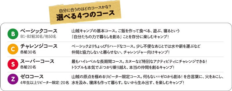 どんなキャンプにするのかは君たち次第!選べる4つのコース!