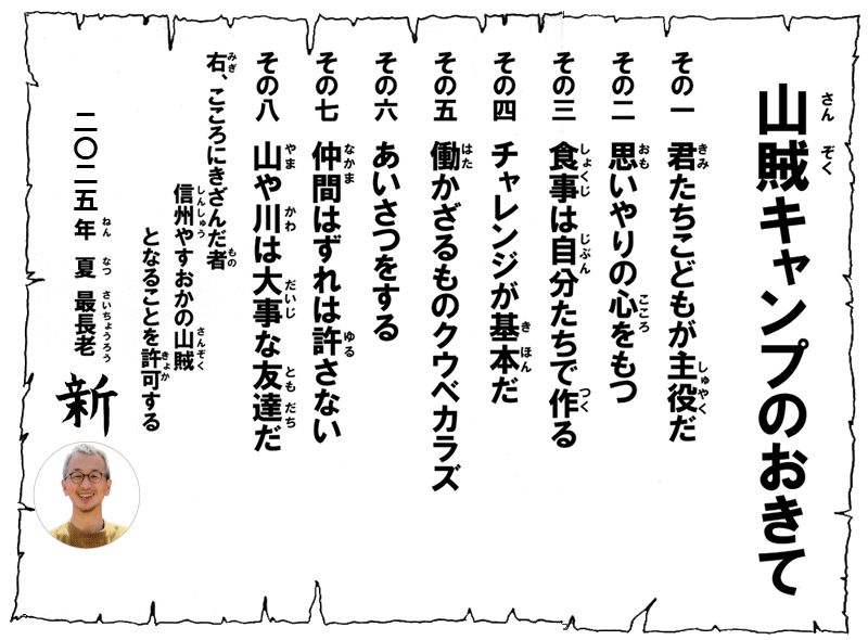 チャレンジを促進し、仲間を作り、こどもたちを守り、こどもたちの世界をひろげるのが山賊のオキテです。
