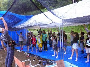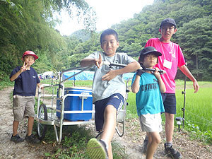 「チャレンジあじと」は「ベーシックあじと」とは違って、水道も薪置き場も近くにないから、生活するために水くみ(バケツリレー)や薪運びをみんなでやる!だからベーシックコースの何倍も苦労する。