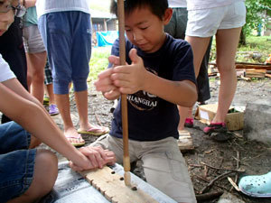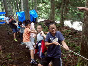 山賊の原点ともいえるリピーター限定キャンプです。何もない=ゼロから創る!を合言葉に、ガスも水道も電気もないあじとで寝床を作り、火を熾し、水を汲んで暮らします。必要な道具もこどもたち自身が考えて選ぶという、こどもたち次第で暮らし方まで変わってくるコースです。 |