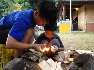 火おこしにもチャレンジです。マッチを擦るのが初めての子は相談員(ボランティア)にサポートしてもらいながらやってみます。