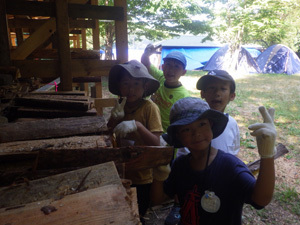 火おこしに使う薪も自分たちで運びます。薪小屋でどの薪が良いのか選び中。
