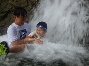 ごはんづくりを頑張った後は、川遊び!滝の水が冷たくて気持ちいい~!
