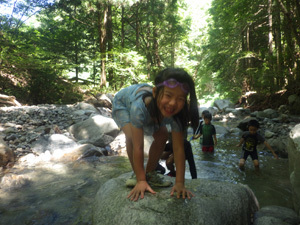沢登りにも行きました。転ばないように両手も上手に使いながら、川の中を登っていきます。