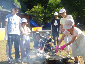 いよいよごはんづくりも終盤です。「お味噌の量はこれくらいかな?」とみんなに相談しながら、味付けにもチャレンジです。