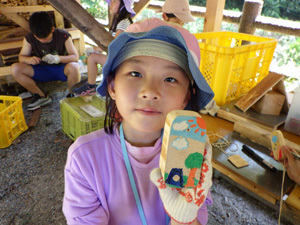 工作では「名札を作りたい!」とのことで、のこぎりや小刀を使って作りました。きれいに形を整えて、手作りの名札が完成です。