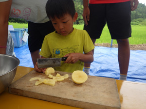 おきての一つ、食事は自分たちでつくる。初めて包丁を握る子も使い方を教わりながらチャレンジしました。